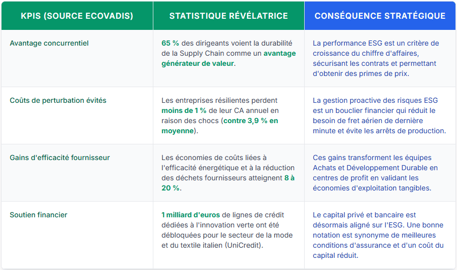 EcoVadis confirme que l’approvisionnement durable est un véritable levier de croissance. Les entreprises les plus résilientes limitent leurs pertes liées aux chocs à moins de 1 % de leur chiffre d’affaires, tout en réalisant 8 à 20 % d’économies grâce à une meilleure efficacité fournisseur.