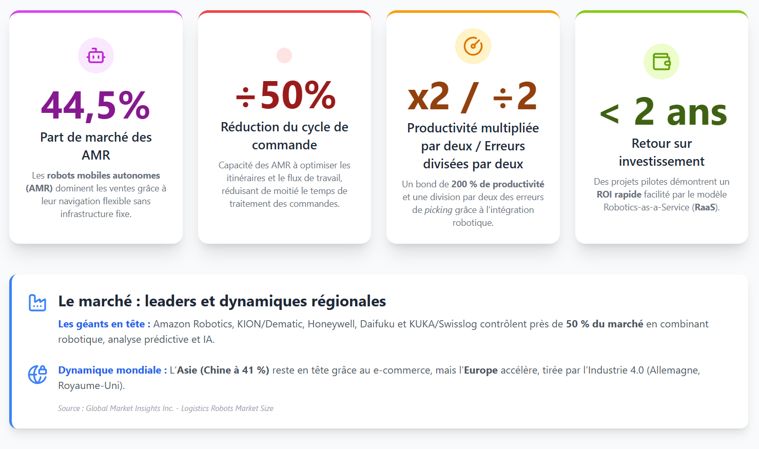 Le marché mondial des robots logistiques atteindra 72,6 milliards $ d'ici à 2034, selon Global Market Insights, avec un CAGR de 17,3 %. Les robots mobiles autonomes et les systèmes de picking automatisés dominent, dopant la productivité de plus de 200 % dans certains entrepôts.