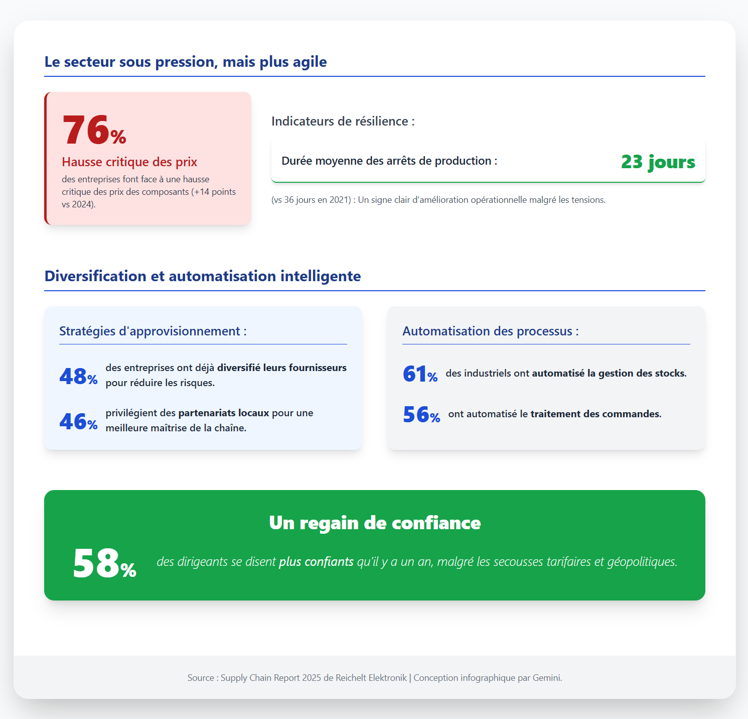 Selon le Reichelt Supply Chain Report, 76 %des entreprises subissent une flambée des prix sur les composants critiques. Si les arrêts de production chutent à 23 jours/an, près d’une sur deux diversifie désormais ses fournisseurs, signe d’une résilience plus locale, mais sous forte pression économique.