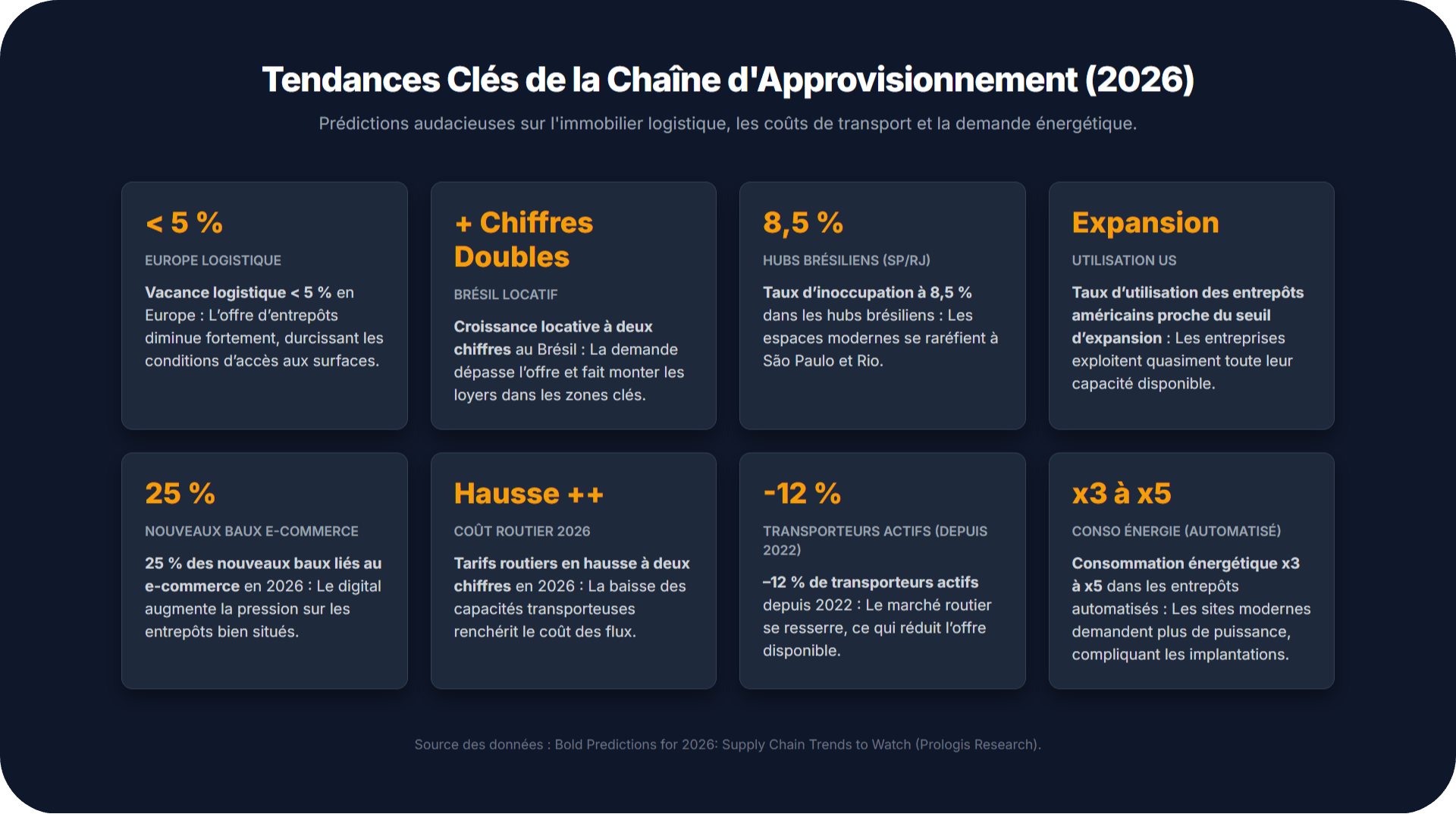 Les prévisions 2026 de Prologis Research annoncent des marchés logistiques internationaux sous tension : vacance en Europe sous 5 %, croissance à deux chiffres des loyers au Brésil, montée en puissance de l’Inde. Le e-commerce pourrait représenter près de 25 % des nouveaux baux et le transport routier voir ses tarifs grimper à deux chiffres.